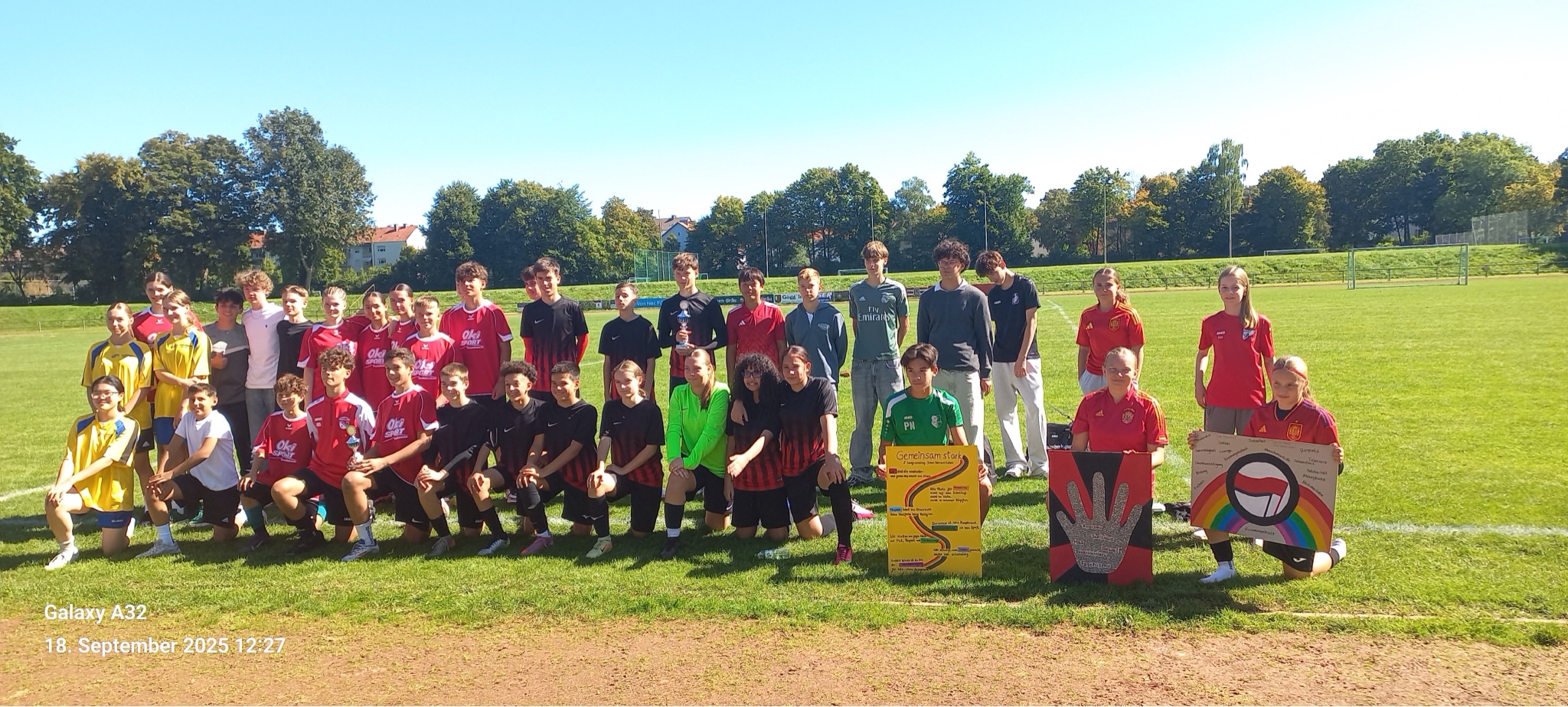 Wichtig: Im Vorfeld bitte pro teilnehmender Schule jeweils Anti-Rassismus und Diversity-Plakate (A2 oder A1) der teilnehmenden Schulen zum Aushang im Stadion!! Dazu evtl. Klassen- oder Kunstlehrkraft ansprechen!